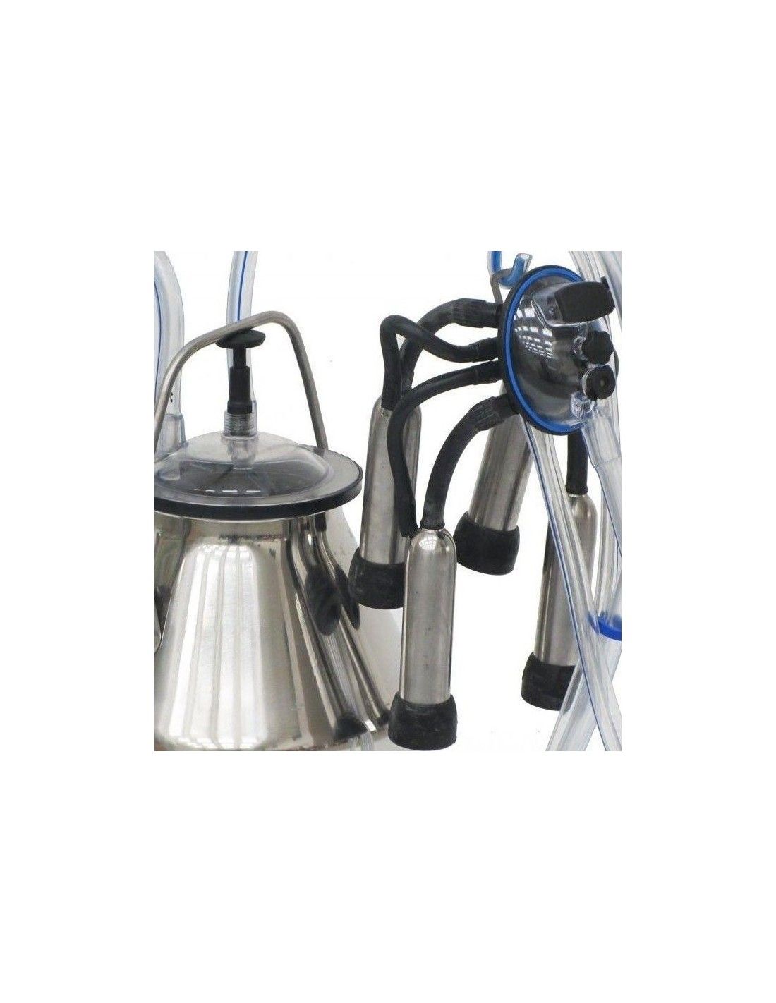 Dotata di pompa da 250 l/min con motore 0,55 kW a 220V, gruppo mungitore con collettore da 250 cc, pulsatore pneumatico 60 bpm e secchio latte in acciaio inox da 30 litri.