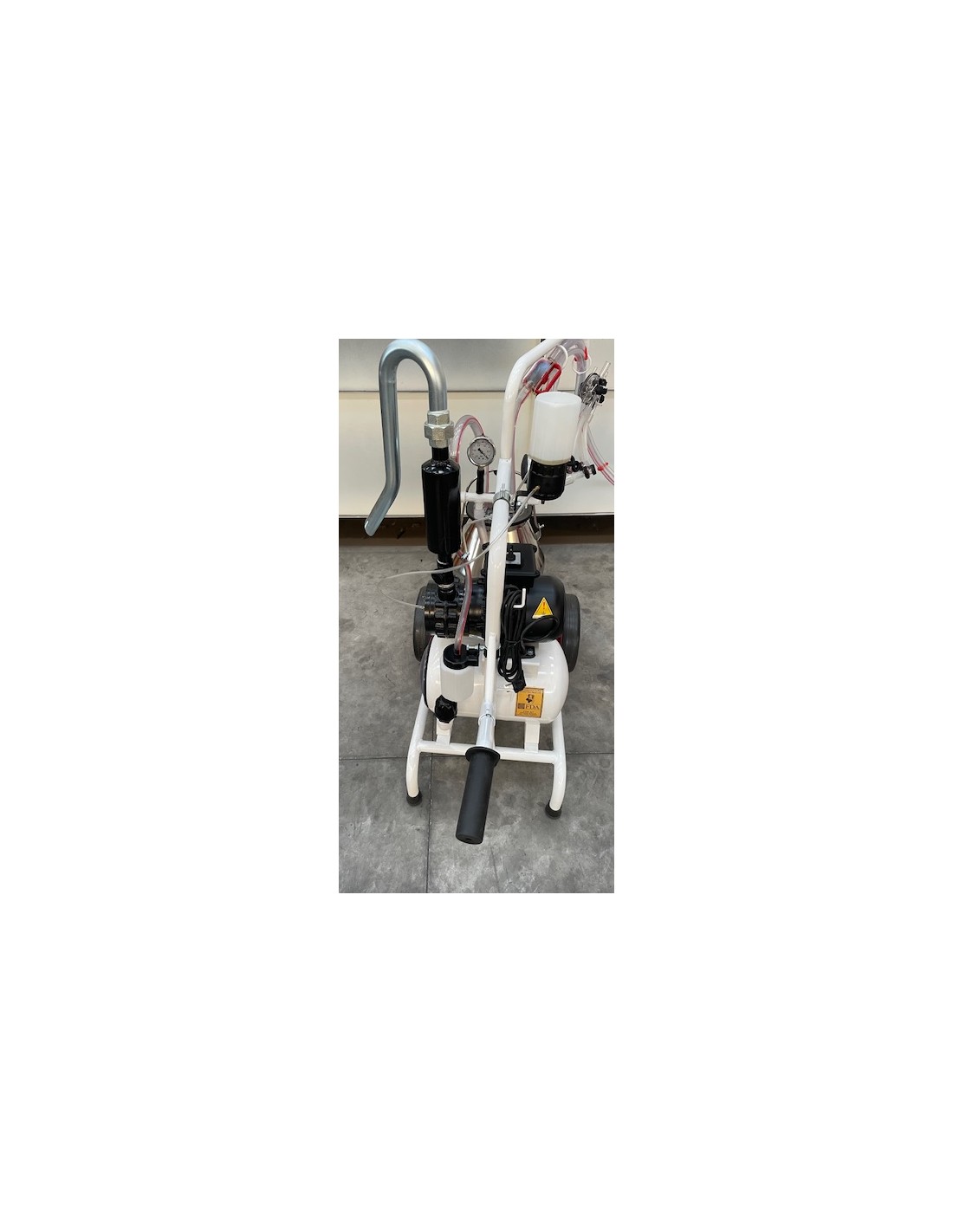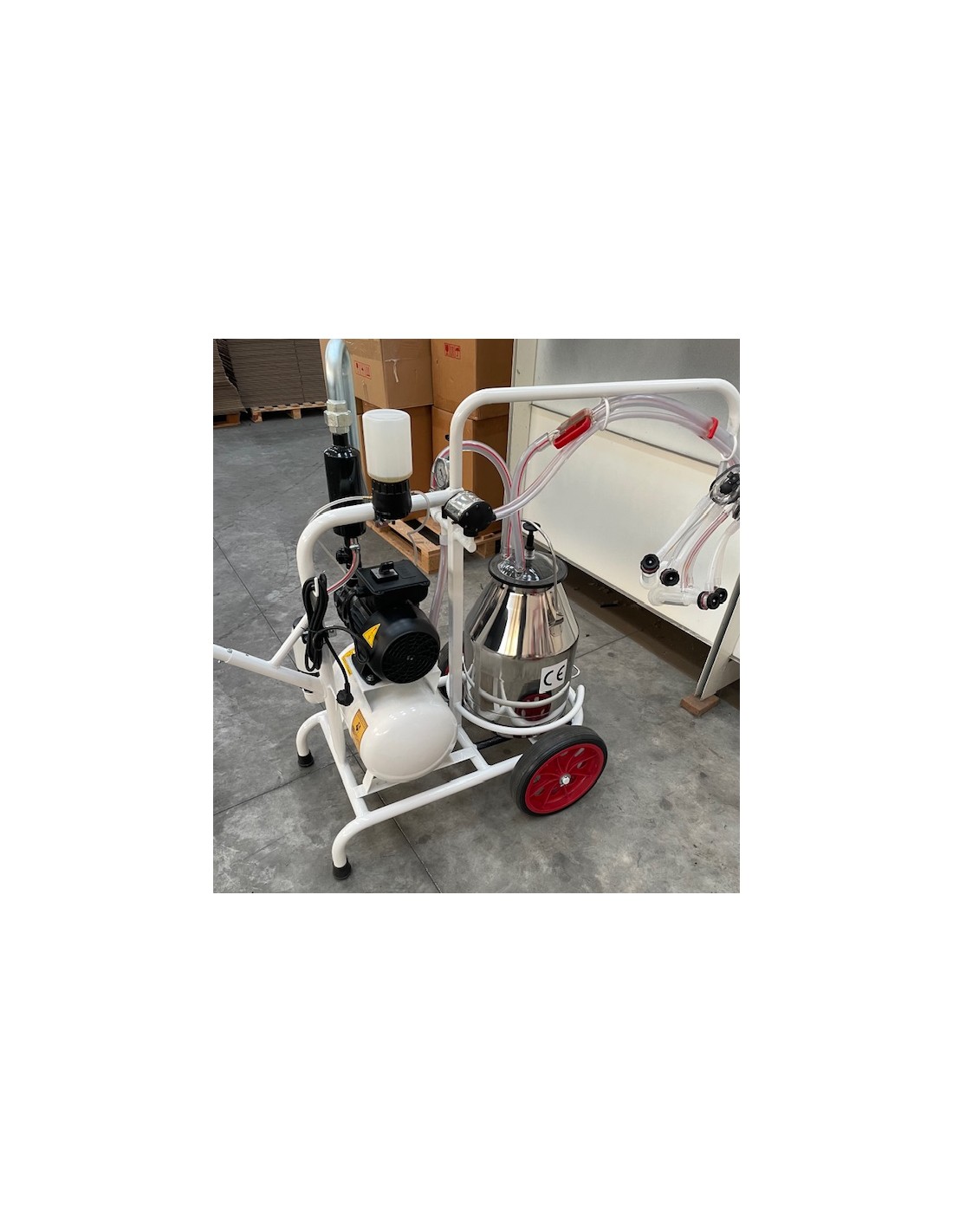 Mungitrice per pecora e capra tipo piccolo . Mungitrice carrellata per ovini e caprini due gruppi mungitura e un bidone del latte da 30 litri. Lunghezza tubazioni trasporto latte 4,0 metri e motore 220 Volt 0,75 kw a bagno d'olio.